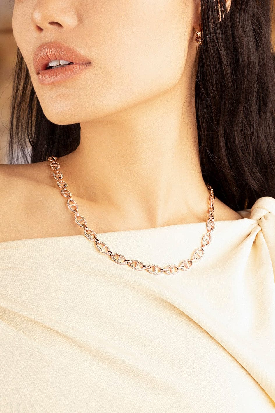 Este collar está hecho de aleación APM rosa y chapados en oro de 18k. Están microengastados con zirconia cúbica blanca.