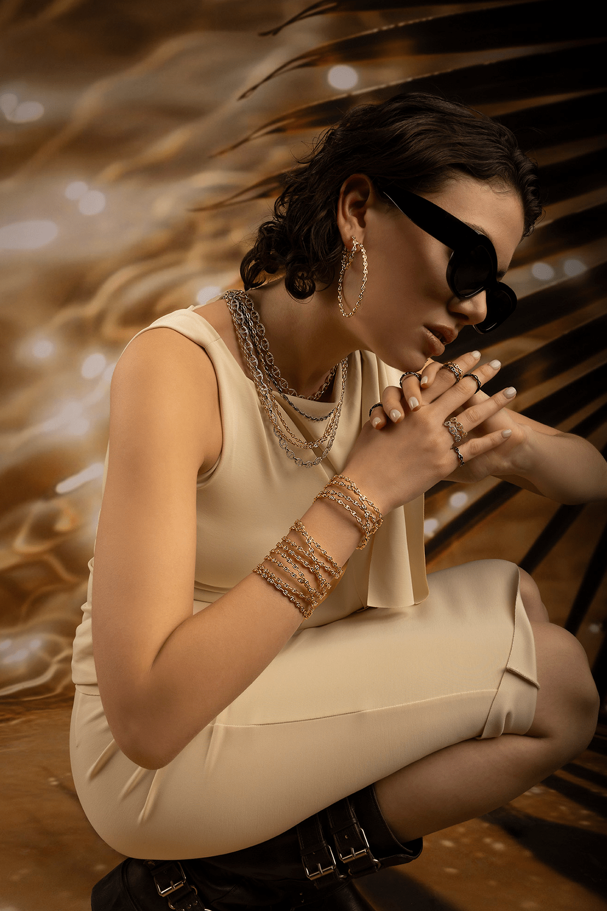 - Material: Aleación amarilla APM fabricada con un 95% de material reciclado y chapada en oro de 18 quilates, circonita cúbica blanca, antideslumbrante y antialérgica