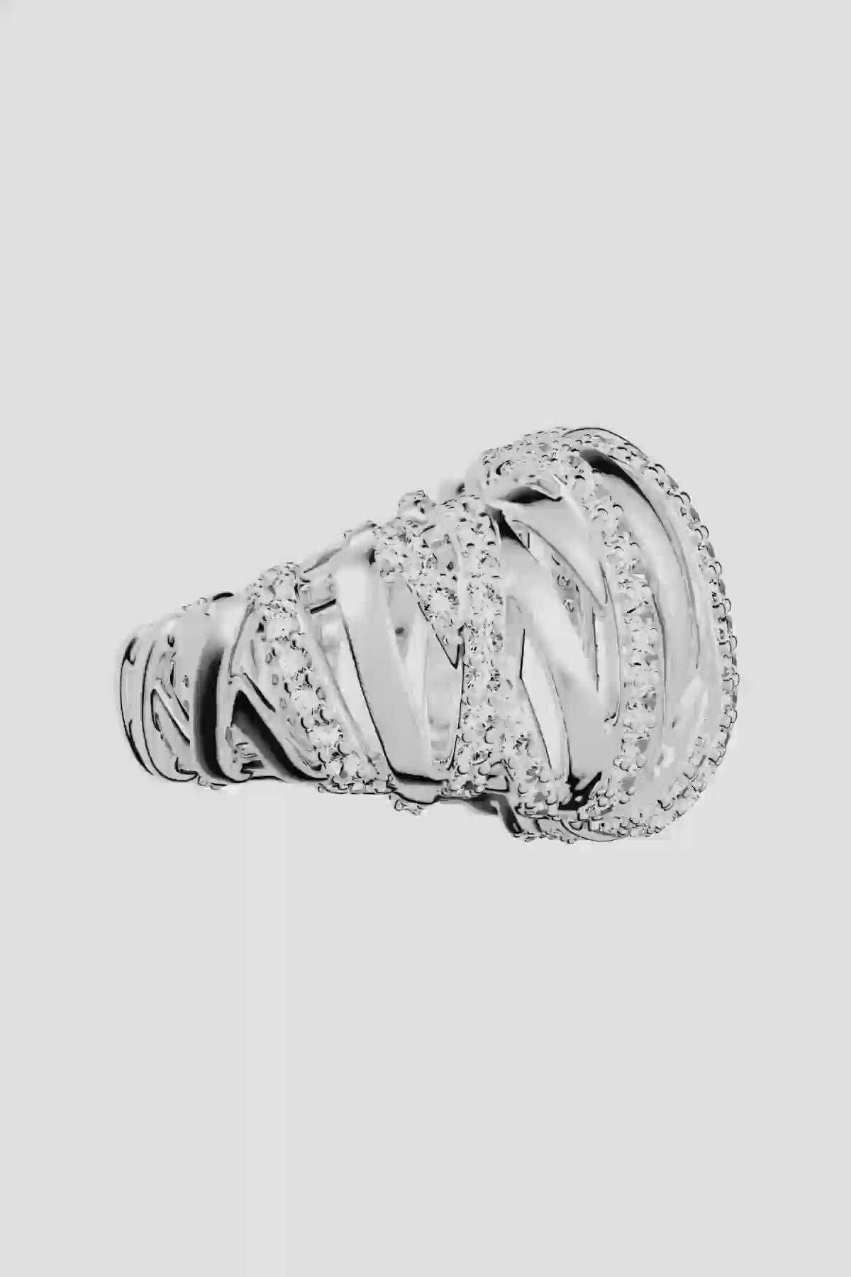 Plata de ley lisa y pavé completo se entrelazan para una fusión armoniosa y elegante de textura y luminosidad. Diseñado para la versatilidad, este anillo encarna sofisticación y estilo.