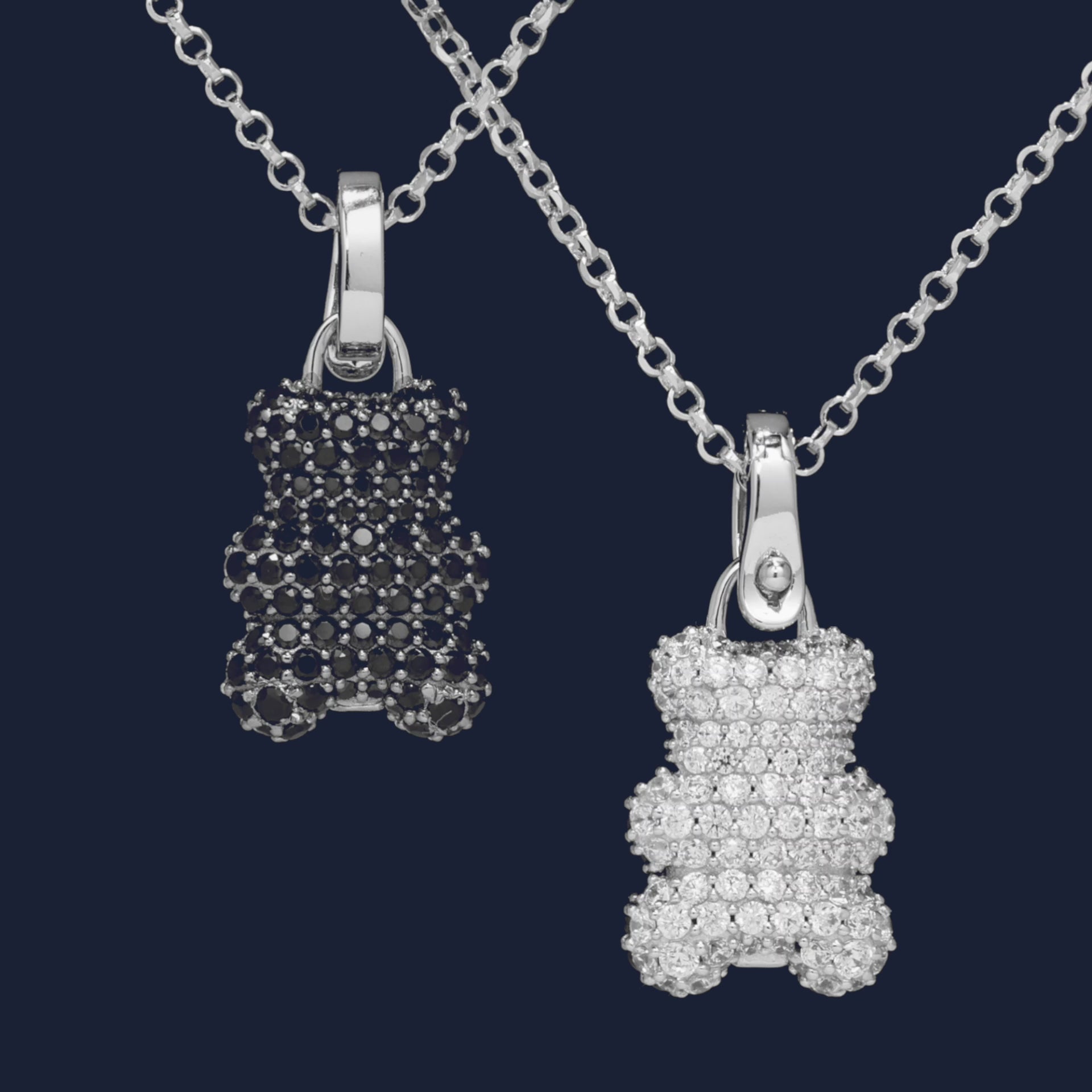 This necklace is handcrafted from sterling silver. The Yummy bear is paved with black spinel on one face and white cubic zirconia on the other.
