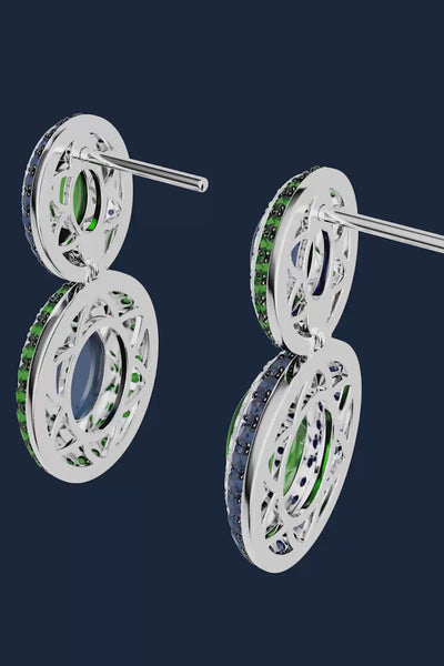 These captivating pieces pavé with vibrant green and sapphire-blue stones blend sophistication and edgy aesthetic. The light shines through, creating a radiant effect.