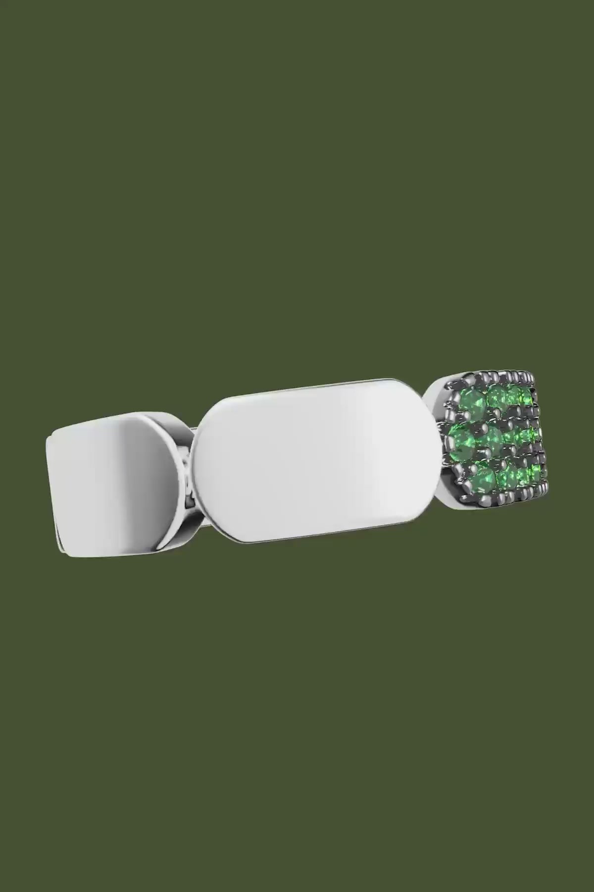 The radiant green stones elegantly complement this ring's design, creating a captivating contrast.
