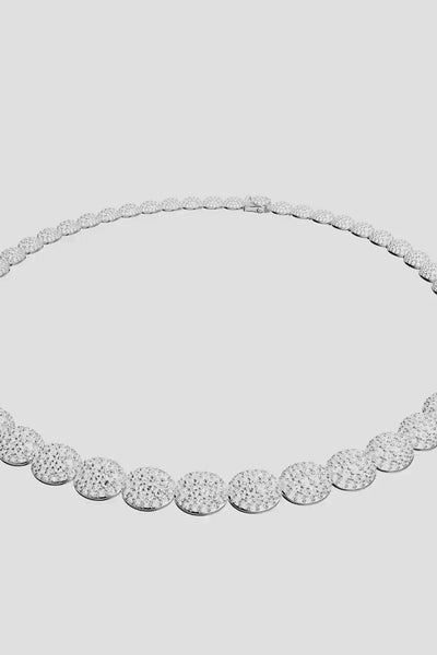 This necklace, meticulously adorned with hundreds of stones, capture the delicate shape of snowflakes. It transitions effortlessly from day to night.