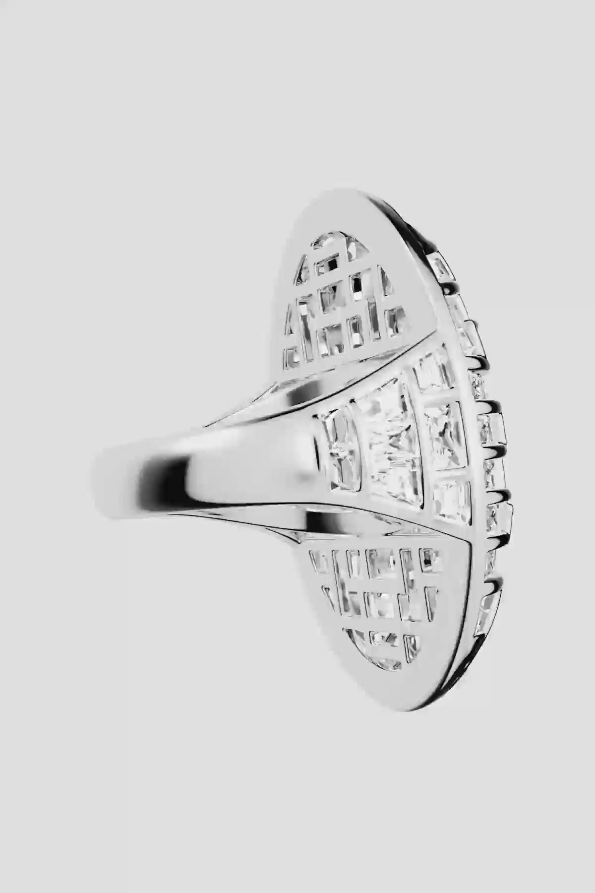 Sterling silver intertwines with paths of brilliant stones to reflect the geometric patterns created by broken ice.