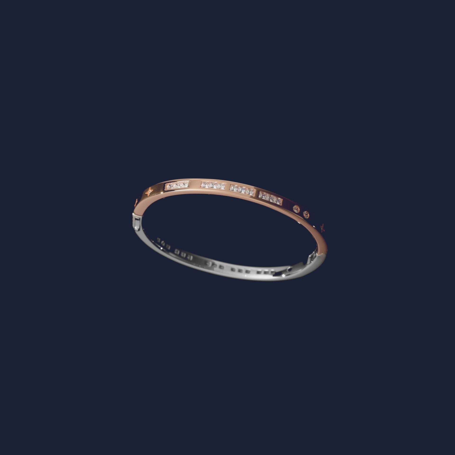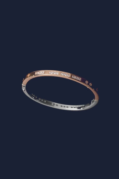 This bangle is handcrafted from sterling silver. It is microset with white cubic zirconia to form the words TOI MOI in Morse Code secret language. The meaning is also engraved inside.