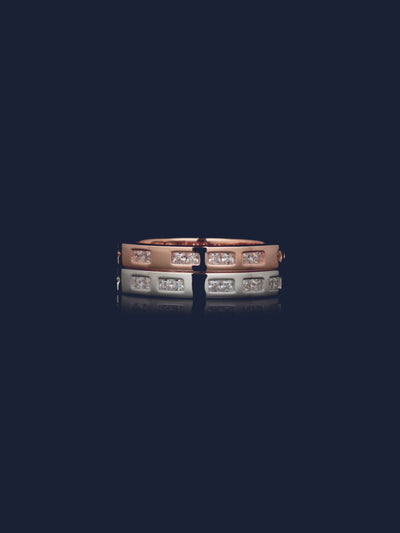 These rings are handcrafted from sterling silver and paved with white cubic zirconia. They are microset with white cubic zirconia to form the words TOI MOI in Morse Code secret language. The meaning is also engraved inside.
