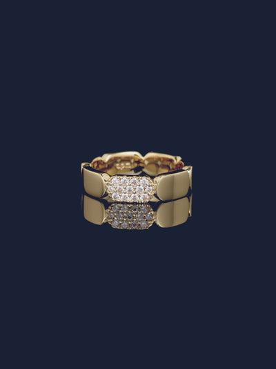 这款戒指由 APM合金和 18K镀金制成,并微镶了白色合成立方氧化锆。
