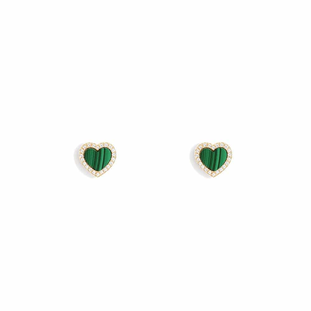这款耳环用APM合金和表面一层3微米的18k金制成。微镶了白色合成立方氧化锆,配以孔雀石。