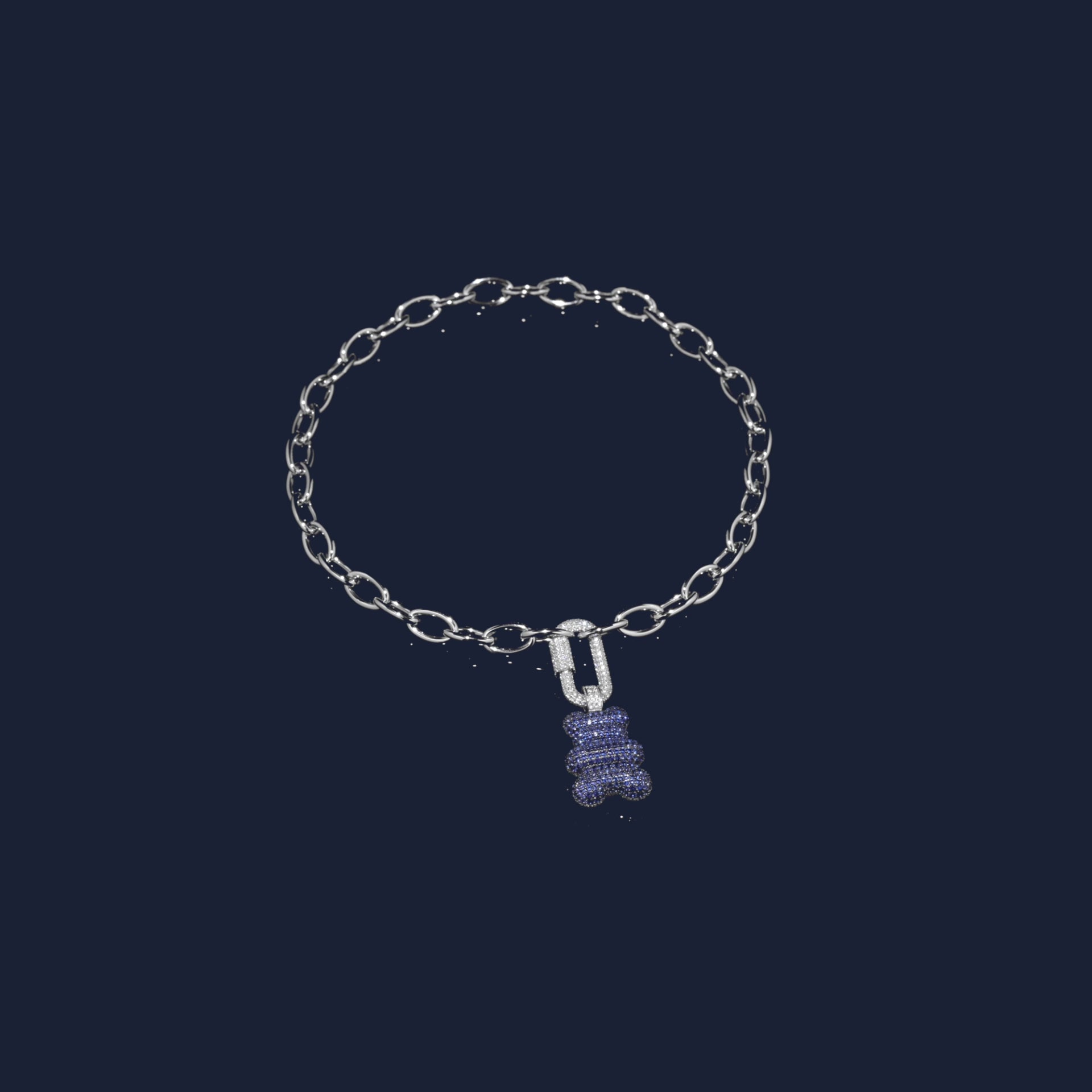 这款项链采用纯银手工制成,YUMMY一面微镶了白色立方氧化锆石,另一面微镶了蓝色纳米石。