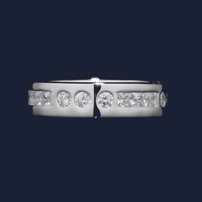 这款戒指以纯银手工制成,微镶了白色氧化锆石,用摩斯密码组成 SMILE图案,内圈雕刻了其寓意。