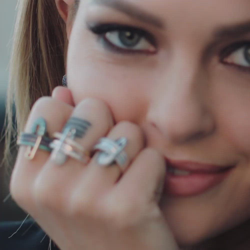 Wear this APM's signature ring with sparkling stones. With a safety pin design, it will add a rock and playful touch to your style. Pair it with other APM rings for a complete look.